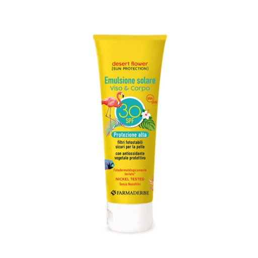 L’EMULSIONE SOLARE VISO & CORPO SPF 30 Desert Flower fa parte della linea solari Farmaderbe.