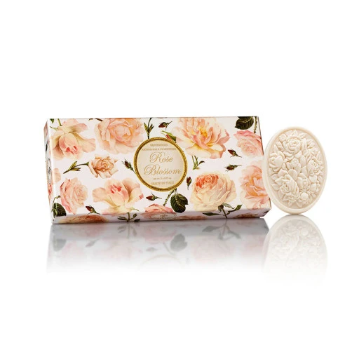 astuccio contenente 3 saponi artigianali profumati ROSE BLOSSOM da 125gr ciascuno.